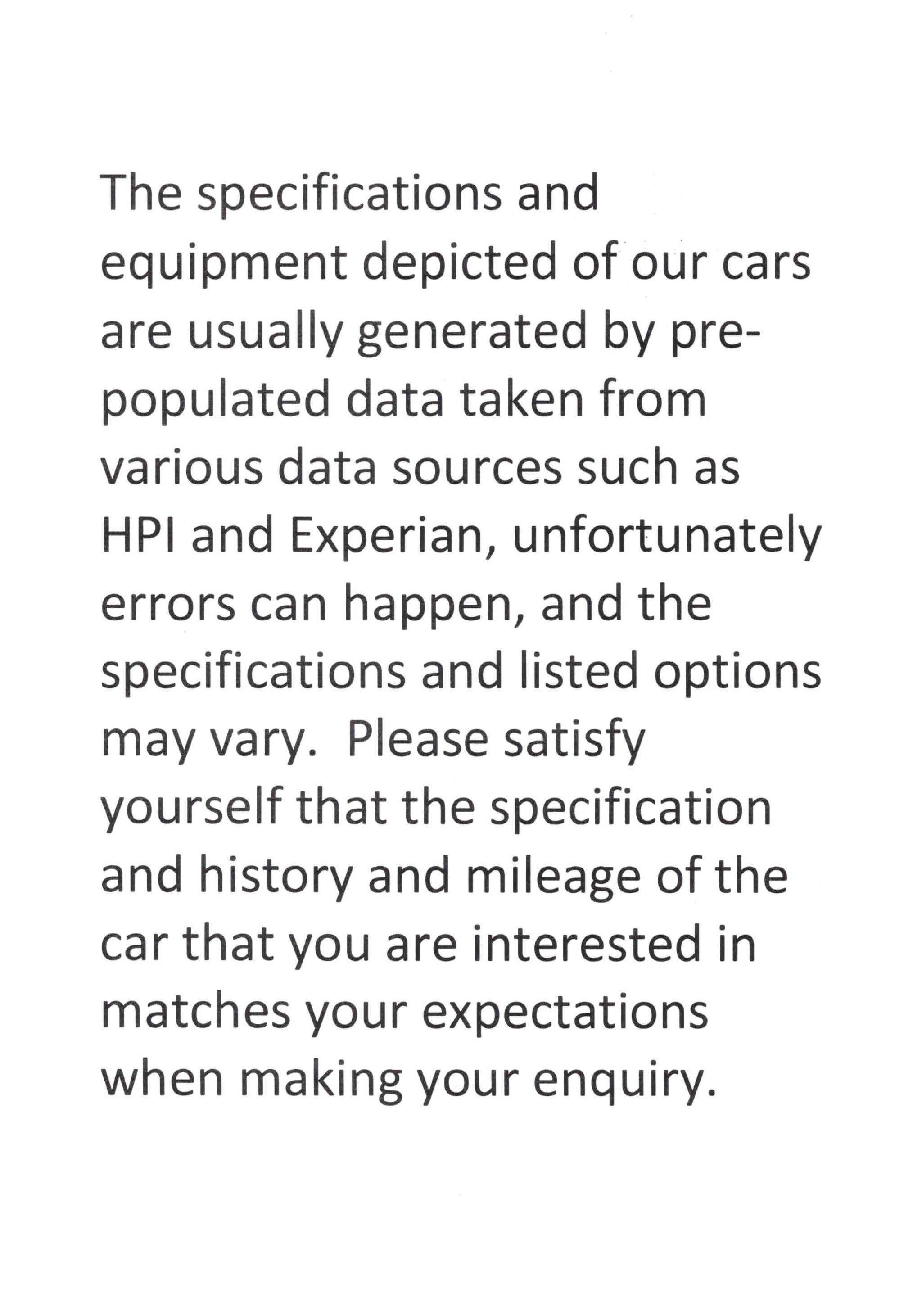 This is the manufacturer's list specification for this model, please verify the details when you view the vehicle. The list below will not include any additional options fitted to the vehicle or modifications.